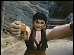 Polly confronts and conquers the thieves one by one, ultimately coming upon the bearer of the Positive Kung Fu volume, who, having made the complete transition from man to woman, has found life on the other side of the gender fence such a burden that she/he has come to hate all men. She does take a bit of a shine to Polly, though, who, as is typical in these movies, is taken for a man by everyone around her despite her clearly appearing to the rest of us as being very obviously a woman.