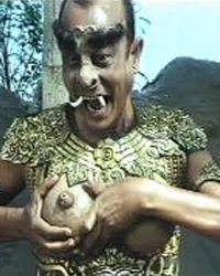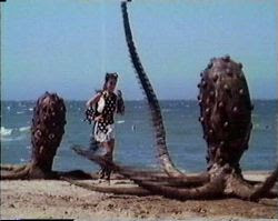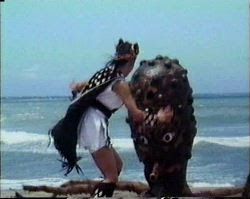 Little Hero lives up in all respects to the crack-addled absurdity of the characters taking part in it, involving such things as giant mouse traps and people rolling around inside enormous pinballs. At the conclusion, the film beats the odds and actually tops itself by having Polly steal Silver Mask's wings and take off after Gold Mask in aerial pursuit. Upon touching down at the beach, she is then, for absolutely no reason, attacked by a pair of giant octopuses that look like Q*bert. For a moment she seems to be getting the upper hand, but then the octopuses start to aggressively birth baby octopuses at her, launching the little ones out of their octo-ginas at her like so many slimy tentacled projectiles. After overcoming these astonishingly fruitful beasts through great effort, she goes on to have a final confrontation with Lo Lieh in what looks like an extremely unsafe version of an elementary school playground where all of the climbing gear is made out of rough cut bamboo.