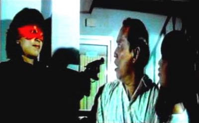 Insee Payong sets out to establish a connection with the classic incarnation of Red Eagle right off the bat, with a scene in which Suksawat's character is shown praying to a shrine centered around a photograph of Mitr Chaibancha in the Red Eagle costume. Now, because this film didn't have subtitles of any kind, I can't tell you whether this means that Jarunee is meant to be some kind of descendant of the earlier Red Eagle, or whether she's just a big Chaibancha fan. It also means that I can't tell you why exactly Jarunee then, in her Red Eagle garb, goes about the business of assassinating a bunch of underworld types in quick succession, using a sort of eagle-shaped throwing star to do the job.In fact, I'd have to say that this version of Red Eagle -- who, I'm happy to report, is simply referred to by the other characters as "Red Eagle", without the gender-specific amendment to her title that you might expect -- generally takes to the carrying out of her crime-fighting duties with extreme prejudice. Her basic m.o. seems to be to show up wherever the criminals are and immediately kill all of them. Not that Chaibancha's version of the hero was markedly more noble in his comportment -- if perhaps not as bloodthirsty, he was a terrible philanderer -- but Jarunee really does just seem to be all about the "kill, kill, kill".