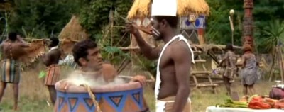 Are there tribes of ooga booga movie savages? Check. Is there a mischievous chimp? Indeed there is -- and the gibbering deaf guy can talk to it! Must a deadly pit of quicksand be traversed? YUP. Are our heroes placed in a giant pot by cannibals? YAWN! In addition to the aforementioned thrills, the Supermen also come upon a tribe of white, leopard skin bikini sporting amazons lead by the self-proclaimed Queen of the Jungle, Jungla (Femi Benussi). So amiably lax is the film in its dedication to having a plot that it then abandons its whole Cold War premise in favor of having the Supermen seduced into a life of domesticity by the amazons, only to find out almost too late that they are destined for the sacrificial altar. Not that much real suspense is forfeited by this shifting of gears, mind you, as the villainous Soviets here are of the type that include a pantsless aparat-chick (see what I did there?) among their number for va-va-voom appeal and celebrate tactical victories by doing a Cossack dance in a chorus line.