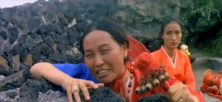 That Island, Parang, turns out to be inhabited solely by women, though it’s far from the amazonian utopias we so often see depicted in B movies. Those men who have not been taken by Iodo have had to flee the island in order to escape its curse, leaving the women to subsist on what they can make by diving along its shores. Unfortunately, that proves to be an increasingly fruitless pursuit, as the accelerating pollution of the waters has decimated the island’s sea life. Through a series of flashbacks, we learn that Cheon, despite leaving Parang, was drawn back to it on more than one occasion, and on the last time, in an attempt to stave off famine, squandered thousands of dollars of the islander’s money on an abalone farm that ultimately failed.